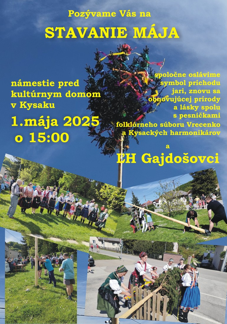 Pozývame Vás na "Stavanie mája" 1. mája 2024 o 15:00 na námestie pred kultúrnym domom v Kysaku.